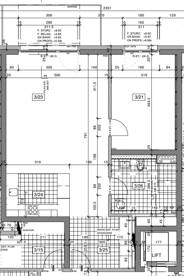Raumhöhen 250 cm, 69 m2, Balkon ca. 10 m2.